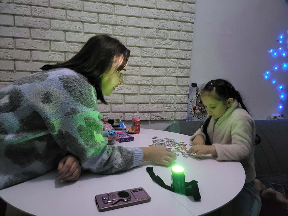 Sedí v tmavém sklepě, na stole leží čelovka, ze které se line slabé zelené světlo. Všude okolo je tma. Yulia pomalu posune dva puzzle kousíčky blíže k dceři, aby na ně ve tmě viděla. Malá šestiletá holčička je zabalená v růžové dece, která ji alespoň částečně chrání před lezavou zimou.